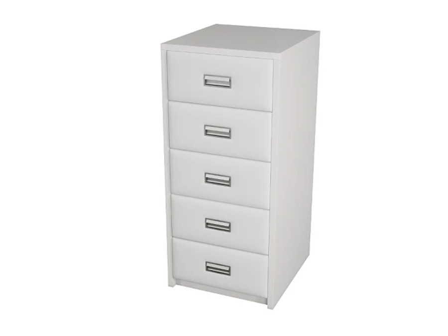 Комод имеет 5 больших ящиков для хранения. Фасад ящиков покрыт обивочным материалом.